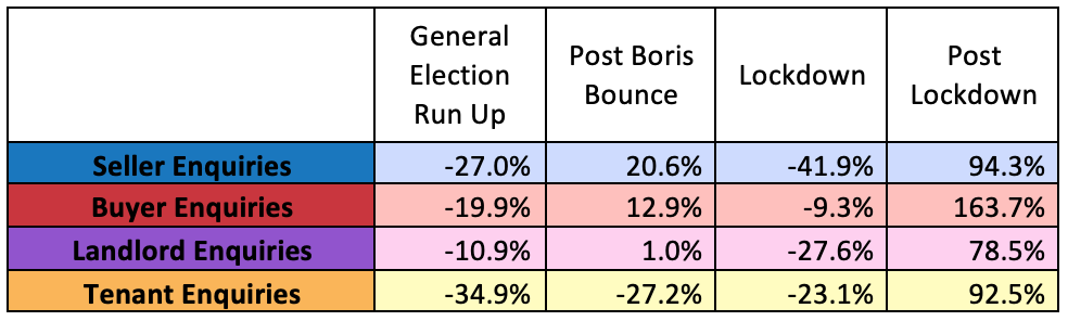 They have created a rolling weekly average of those enquiries for the whole of the UK for the 62 weeks before the country went into lockdown. Then they compared that 62 week average with specific time frames, namely the 10 weeks of the run up to the General Election, the 8 weeks of Post Boris Bounce in January and February 2020, the weeks of lockdown in March, April and early May and then finally, from mid-May, the post lockdown.