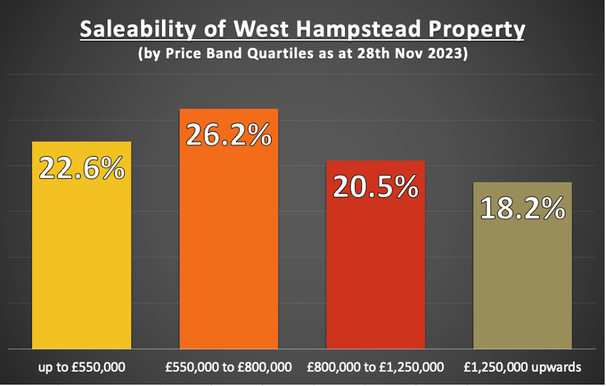 So, having split the West Hampstead property market approximately into four equal sizes, the results in terms of what price band has sold (subject to contract or stc) the most is quite enlightening –